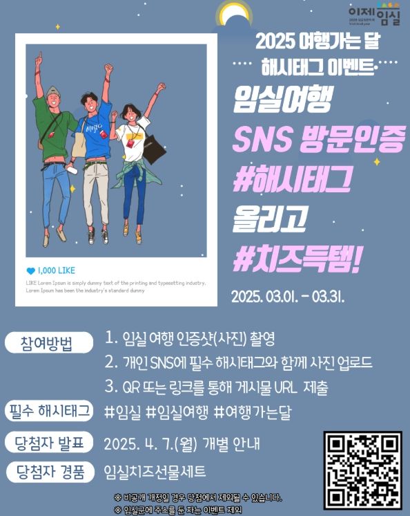 (아름다운교육신문) 임실군이 문화체육관광부가 주관하는 국내 여행 참여 분위기 조성 캠페인‘2025년 3월 여행가는 달’을 맞아 3월 1일부터 3월 31일까지 한 달간 ‘임실 여행 SNS 방문 인증 이벤트’를 추진한다.