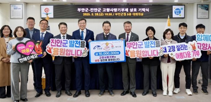 (아름다운교육신문) 부안군과 진안군이 28일 지역 상생 발전과 고향사랑기부제 활성화를 위해 상호 1천만 원씩 기부하며 협력의 뜻을 다졌다.