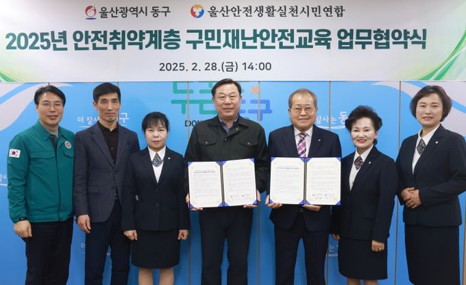 (아름다운교육신문) 울산 동구는 2월 28일 오후 2시 구청장실에서 울산안전생활실천시민연합과 함께 안전취약 계층을 대상으로 2025년도 찾아가는 맞춤형 구민 재난안전 교육 활성화를 위한 업무협약을 체결했다.