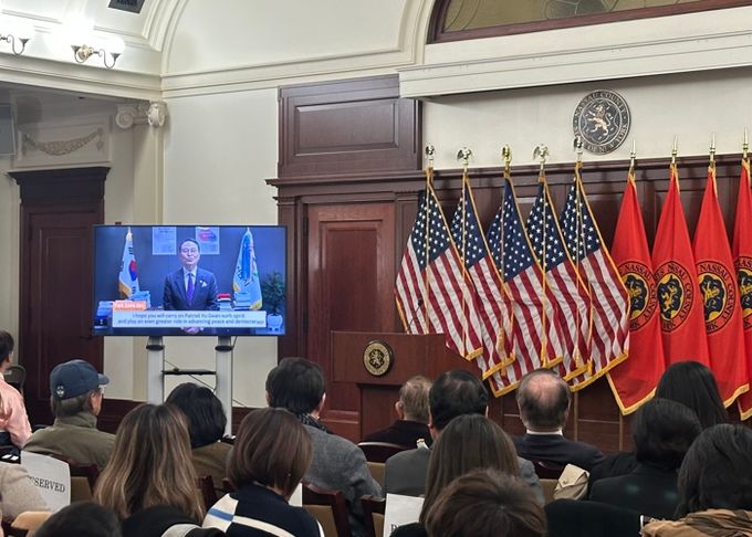 윤은미 천안시 복지정책국장 등으로 구성된 천안시 대표단은 지난 27일(현지시간) 뉴욕 루즈벨트 행정입법부에서 열린 3.1운동 기념식 및 제6회 유관순상 시상식에 참석해 축하영상과 장학금을 전달했다.