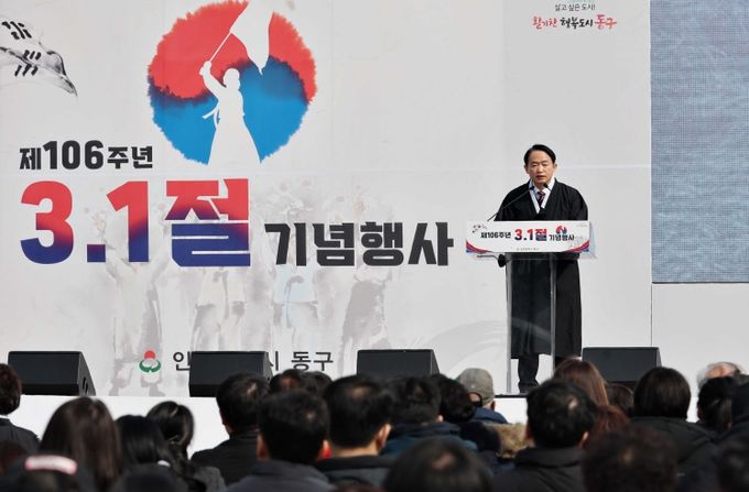인천 동구(구청장 김찬진)는 제106주년 3.1절을 맞아 인천 독립운동의 발상지 인천창영초등학교에서 애국선열들의 정신과 숭고한 희생정신을 기리는 기념행사를 개최했다.