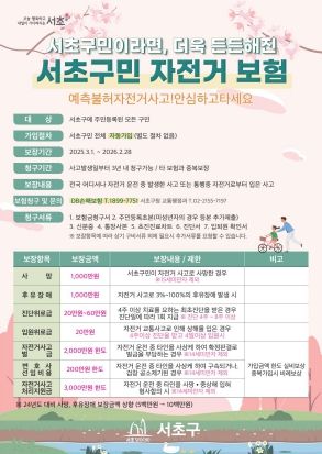 보험기간은 올해 3월부터 내년 2월까지로 사고일 당시 서초구에 주민등록이 되어있는 주민이라면 별도 절차 없이 자동으로 가입되고, 전국 어디서라도 자전거 사고가 발생하면 혜택을 받을 수 있다. 구는 지난 2018년부터 구민 자전거 보험을 시행한 바 있으며, 7년간 총 971명의 주민이 3억 7천여만 원의 보상을 받았다.