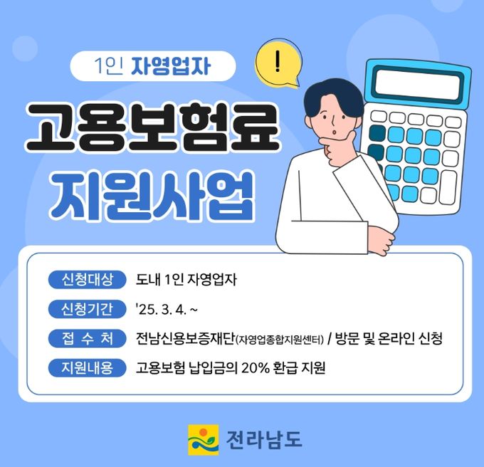 고용보험료 지원을 바라는 1인 자영업자는 4일부터 전남신용보증재단(자영업종합지원센터)으로 직접 방문하거나 누리집에서 신청할 수 있다.