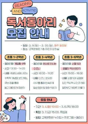 (아름다운교육신문) 대전학생교육문화원은 함께 읽고 공유하는 독서문화 확산을 위해 3월 9일부터 초등학생을 대상으로 2025년 초등 독서동아리를 운영한다고 밝혔다.