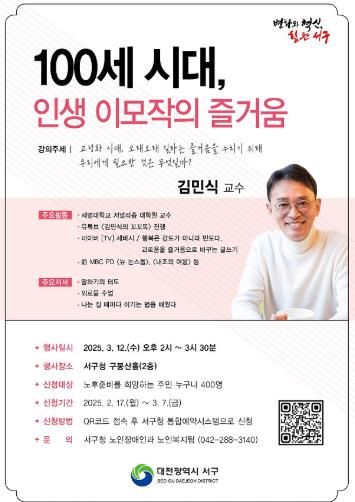 강의는 당일 수요일 오후 2시 서구청 2층 구봉산홀에서 개최되며, 유튜브 '김민식의 꼬꼬독'과 네이버 TV '세상을 바꾸는 시간 15분'에서 노후 준비 관련 강의를 진행하고 있는 세명대학교 저널리즘 대학원 김민식 교수가 진행한다.