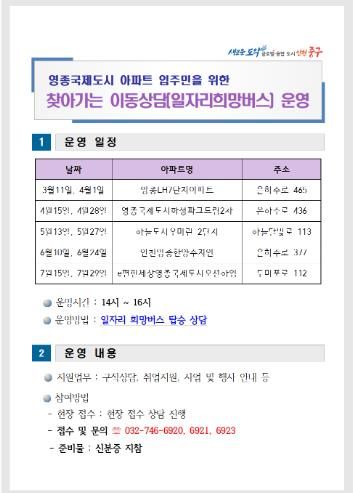 올해 일자리 희망버스는 3월부터 매월 둘째·넷째 주 화요일 오후 2시부터 4시까지 영종국제도시 소재 아파트 부근을 찾아가는 식으로 운영된다.