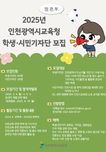 (아름다운교육신문) 인천광역시교육청은 학생과 시민의 자발적인 인천교육 홍보 장려를 위해 2025 학생‧시민기자단을 모집한다.
