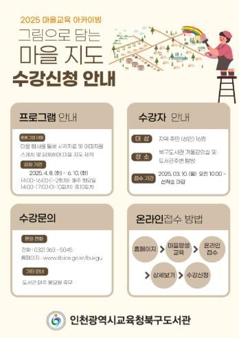 (아름다운교육신문) 인천광역시교육청북구도서관은 오는 10일부터 ‘마을 교육 아카이빙’학습자를 모집한다.