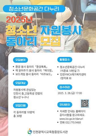 (아름다운교육신문) 인천광역시교육청중앙도서관 청소년문화공간 다누리에서는 환경 보호와 나눔을 실천하는 ‘2025년 청소년 자원봉사 동아리’ 회원을 모집한다.