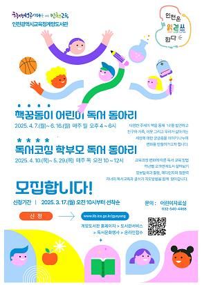 (아름다운교육신문) 인천광역시교육청계양도서관은 초등 3, 4학년 대상‘책꿈동이’와 학부모 대상 ‘독서코칭’ 동아리 참여자를 모집한다.