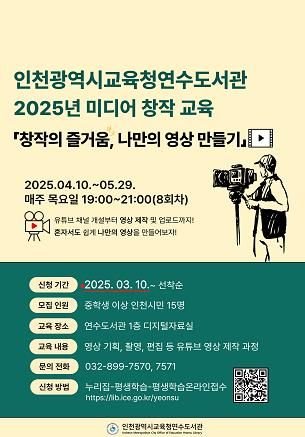 (아름다운교육신문) 인천광역시교육청연수도서관은 시민들의 미디어 창작 활동을 지원하기 위해 ‘창작의 즐거움, 나만의 영상 만들기’를 운영한다.