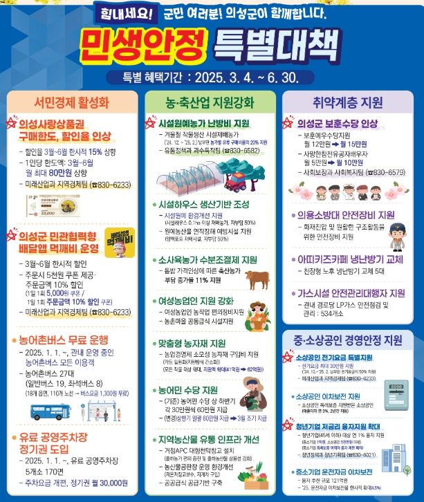 (아름다운교육신문) 의성군은 고물가와 경기 침체로 어려움을 겪고 있는 군민들의 일상 생활 안정과 민생경제 회복을 위한 특별대책을 발표하고‘민생안정 행복 프로젝트’를 본격 추진한다.