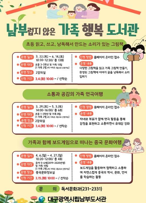(아름다운교육신문) 대구남부도서관은 가족이 함께 책을 읽고 소통하며 독서 습관을 형성하고 가족 간 유대감 강화시키기 위해 3월부터 ‘남부럽지 않은 가족 행복 도서관 프로그램’을 운영한다고 밝혔다.