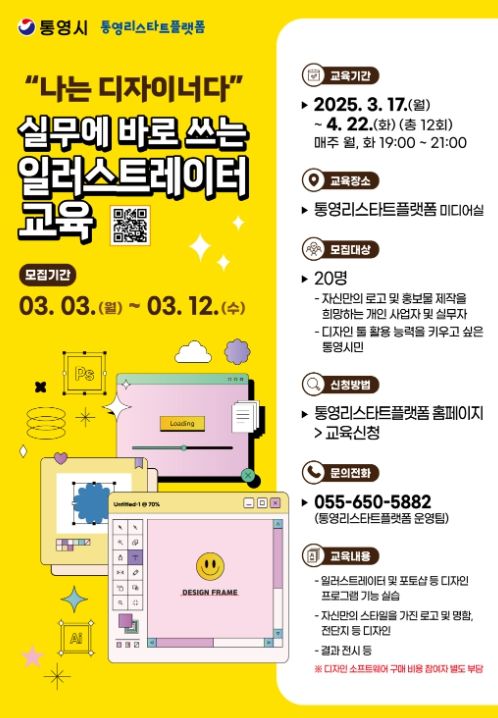실무에 바로쓰는 일러스트레이터 교육은 봉평지구 도시재생뉴딜사업 일환으로 조성된 통영리스타트플랫폼의 취・창업 프로그램이며, 소상공인과 개인 창작자를 대상으로 로고, 명함, 전단지 제작 등의 실무 디자인 기술을 익힐 수 있도록 기획됐다.