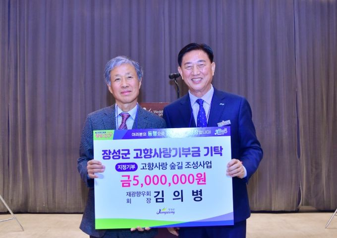 군에 따르면 지난 25일 재광장성군향우회 신년회에서 김의병 회장이 고향사랑기부제 지정기부사업인 ‘고향사랑 숲길 조성사업’에 500만 원과 장학금 500만 원, 총 1000만 원을 장성군에 쾌척했다.