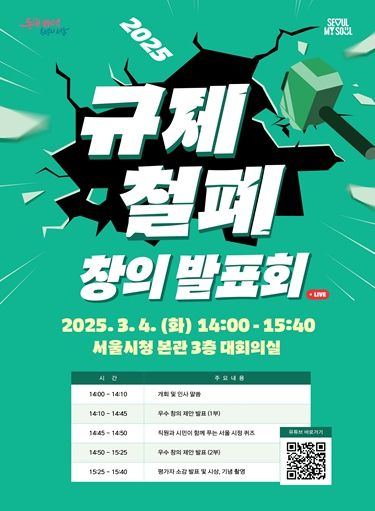 서울시는 3월 4일 오후 2시 서울시청 대회의실(3층)에서 시민‧전문가 150여 명이 참석한 가운데'규제철폐 창의 발표회'를 진행한다. 이날 발표회에서는 1월 한 달간 공무원들에게 제안받은 753건의 규제철폐 제안 중 시민 온라인 사전투표 결과와 ‘규제철폐전문가 심의회’ 의견을 반영한 10건이 공개된다.