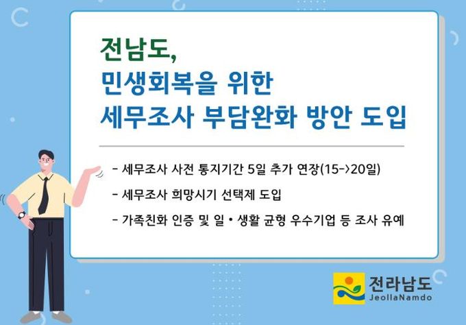 (아름다운교육신문) 전라남도는 2025년 지방세 정기 세무조사 대상 60개 법인을 선정, 조사 시기를 선택토록 하고, 가족친화기업 조사를 유예하는 등 기업의 경영 부담을 줄이고 민생경제를 회복하기 위한 대책을 마련해 추진한다고 밝혔다.