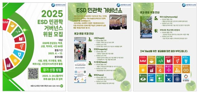 (아름다운교육신문) 세종특별자치시교육청은 오는 3월 24일까지 ‘2025 지속가능발전교육(ESD) 민·관·학 거버넌스’에 자발적으로 참여할 학생, 교직원, 학부모, 세종시민 등 총 80명을 모집한다.