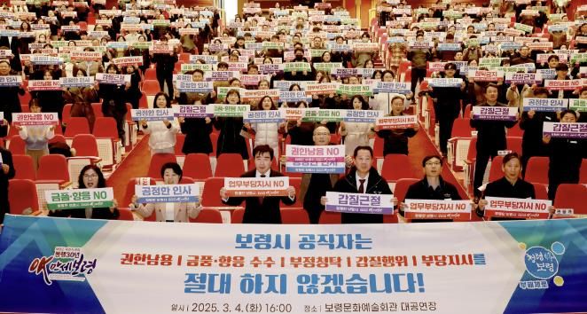 보령시 공직자로서 부정부패를 척결하고 금품 수수없는 깨끗한 행정을 펼치겠다는 내용을 담은 청렴결의문을 낭독하고, 김동일 시장의 청렴선언과 퍼포먼스로 청렴 의지를 전달했다.