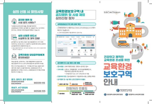 (아름다운교육신문) 대전시교육청은 건강하고 쾌적한 교육환경 조성을 위해 학교, 유관기관, 공인중개사협회 등을 대상으로 교육환경보호구역제도, 보호구역 조회사이트 이용방법, 금지행위․시설, 심의 절차 등을 수록한 홍보물을 제작하여 각급학교와 관련기관에 배포한다.