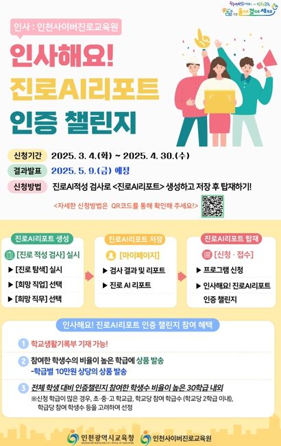(아름다운교육신문) 인천광역시교육청은 4월 30일까지 관내 초·중·고등학생을 대상으로 ‘진로인공지능(AI)리포트 인증 챌린지’를 운영한다.