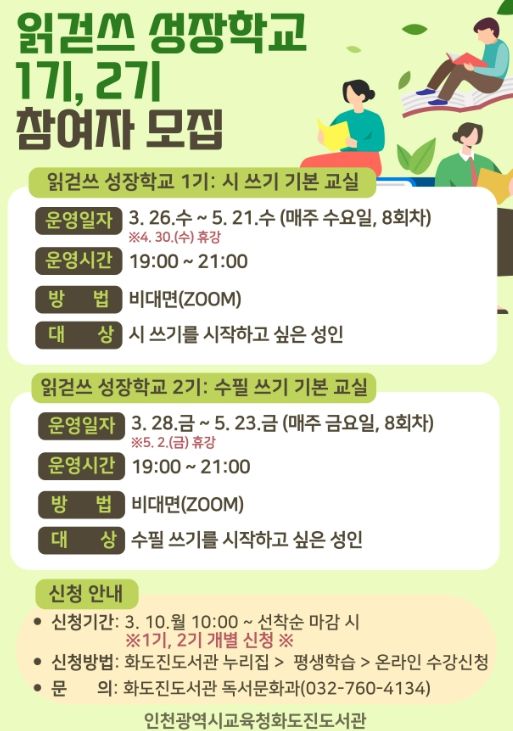 (아름다운교육신문) 인천광역시교육청화도진도서관은 성인 글쓰기 역량 강화를 위한 프로그램 ‘2025년 읽걷쓰 성장학교 1-2기’의 참여자를 모집한다.