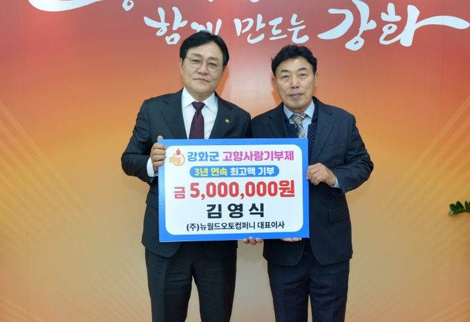 (아름다운교육신문) 강화군은 5일 김영식 ㈜뉴월드오토컴퍼니 대표가 고향사랑기부제 3년 연속 최고액 기부자로 이름을 올렸다고 밝혔다.