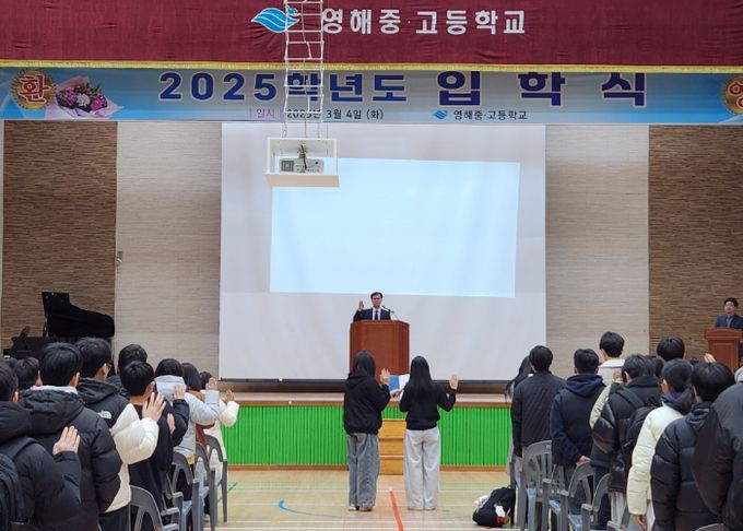 (아름다운교육신문) 영해고등학교는 지난 4일 예송관(체육관)에서 신입생(39명) 및 재학생(118명)과 함께 ‘2025학년도 제71회 입학식’을 실시했다. 많은 내빈들이 영해고등학교의 새로운 출발을 응원하고 39명 신입생들의 행복한 미래를 함께 응원했다.