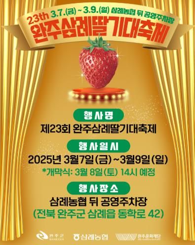 5일 완주 삼례딸기축제제전위원회는 오는 7일부터 9일까지 삼례농협 인근 공영주차장 일원에서 ‘제23회 완주 삼례딸기 대축제’를 연다고 밝혔다.