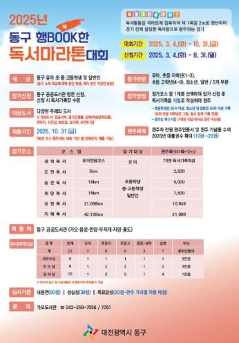 (아름다운교육신문) 대전 동구는 구민들의 독서 생활화와 독서 문화 확산을 위해 3월부터 10월까지 ‘2025년 동구 행BOOK한 독서마라톤 대회’를 개최한다고 5일 밝혔다.