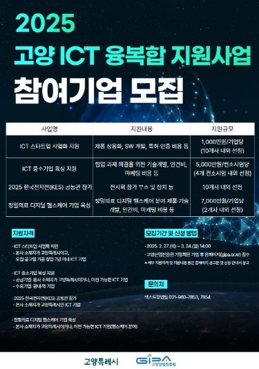 (아름다운교육신문) 고양산업진흥원이 ‘2025 고양 ICT 융복합 지원사업’참여 기업을 오는 3월 24일까지 모집한다고 밝혔다.