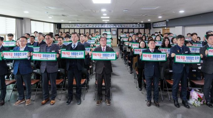 (아름다운교육신문) 합천군은 지난 5일 합천군청 대회의실에서 군수를 비롯한 고위직 공무원을 포함한 직원 100명이 참석한 가운데 ‘청렴마인드 강화 퍼포먼스’를 개최했다.0