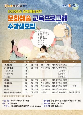 수강 신청은 3월 4일부터 3월 14일까지 선착순으로 접수하며, 장흥문화예술회관을 직접 방문하거나 이메일로 신청하면 된다.