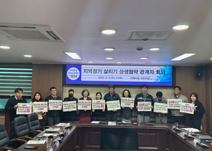 앞선 2024년 7월 22일 관내 소상공인, 자영업자에 대한 지원과 지역 농․수산․특산물 구매 증진을 위한 상호 협력을 위해 거제시, 거제시의회, 거제상공회의소, 거제소상공인연합회, 양대 조선소 및 양대 조선소협력사협의회, ㈜건화 총 9개 기관․단체가 ‘지역경기 살리기 상생협력 협약’을 체결했다. 이번 회의는 각 참여기관․단체 관계자가 모여 추진사항을 공유하고, 지역경제 현안 의견청취 및 협약 이행 제고 방안을 모색하기 위해 마련됐다.