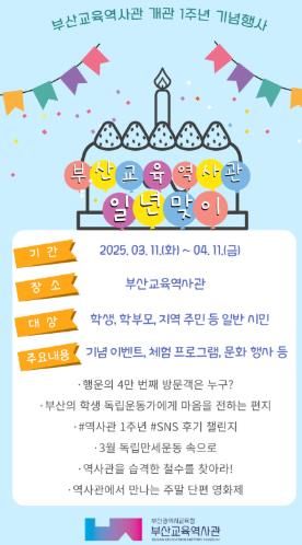부산광역시교육청부산교육역사관은 오는 3월 11일부터 4월 11일까지 학생과 학부모, 시민을 대상으로 개관 1주년 기념 행사 ‘부산교육역사관 일년맞이’ 행사를 개최한다.