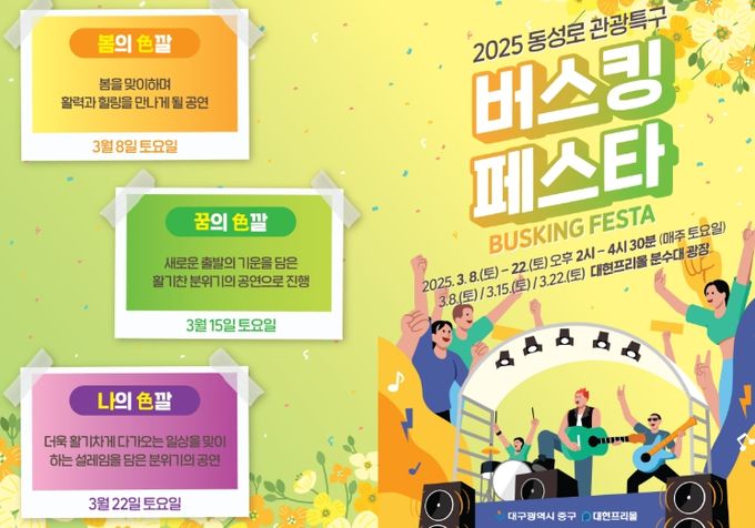 (아름다운교육신문) 대구 중구는 3월 8일부터 22일까지 매주 토요일 오후 2시 대현프리몰 중앙광장에서 동성로 관광특구 버스킹 페스타를 개최한다.