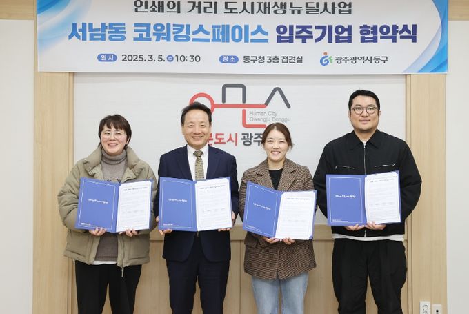 (아름다운교육신문) 광주 동구는 지난 5일 인쇄의 거리 도시재생 활성화 사업의 일환으로 추진 중인 ‘코워킹 스페이스 공간 지원사업’에 선정된 입주기업 3곳과 협약을 체결했다고 밝혔다.