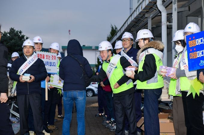 참여자들은 현장 근로자를 향해 ‘작업은 안전하게, 퇴근은 활기차게’ 안전 구호를 제창하고 홍보물을 배부하는 등 근로자 안전의식 고취에 힘썼다.