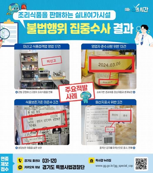 주요 위반 사례를 보면 김포시 A스크린골프장은 식품접객업 영업 신고 없이 주방시설 등을 갖추고 이용객을 대상으로 조리식품 등을 제공하다 적발됐다. 성남시 B피씨방은 소비기한이 11개월 지난 우동다시 등 총 5종의 제품을 ‘폐기용’ 또는 ‘교육용’ 표시 없이 정상 식재료와 함께 보관해오다 적발됐다. 또한, 평택시 C피씨방은 보관기준이 10℃이하 냉장보관인 양파드레싱 등 총 3종의 소스류를 주방시설 내 실온보관대에 보관해 왔으며, 광주시 D키즈카페는 매장 내 원산지 표시판에 감자를 미국산이라 표시하고 중국산 감자를 조리·판매하다 적발됐다.