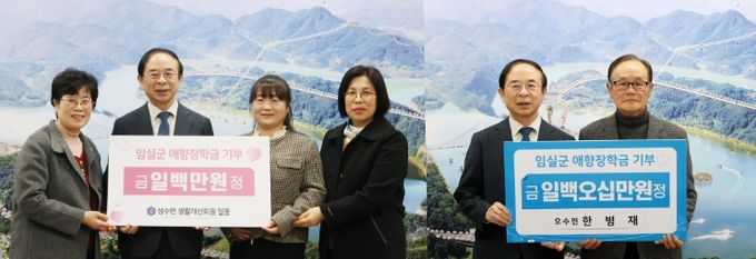 지난달 28일 임실군청을 방문하여 성수면 생활개선회(회장 정옥순)에서 100만원을 전달했고, 오수면 봉산마을 한병재 씨도 150만원을 애향장학금으로 기부했다.