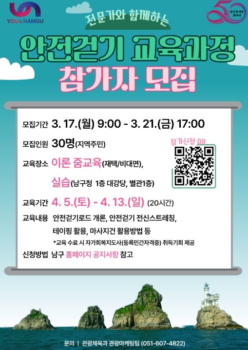 (아름다운교육신문) 부산 남구는 건강한 걷기 습관과 효과적인 자가회복에 관심있는 지역주민을 위해 ‘전문가와 함께하는 안전걷기 교육과정’을 운영한다.