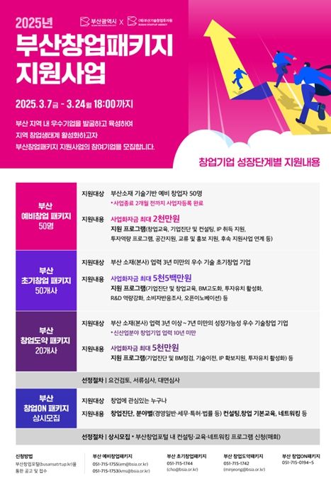 부산시는 오늘(7일)부터 3월 24일까지 창업기업의 지속 성장을 위해 단계별로 맞춤 지원하는 '2025년 부산창업패키지 지원사업'의 첫 통합공고를 시행해, 참여 기업을 본격적으로 모집한다고 밝혔다.