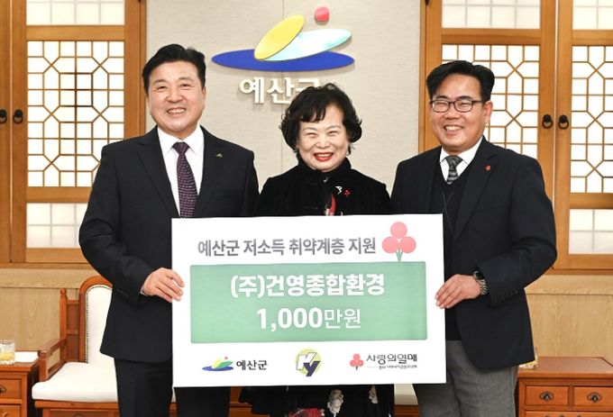 (아름다운교육신문) 예산군은 지난 6일 군 1호 사회복지공동모금회 나눔명문기업인 ㈜건영종합환경(대표 박원정)이 1000만원을 군에 기탁했다고 밝혔다.