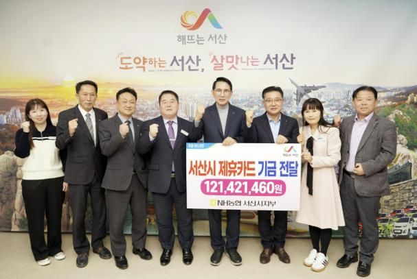 NH농협은행 서산시지부가 전달한 기금은 약 1억 2천1백만 원으로 서산시와 제휴한 보조금 카드, 서산사랑카드, 공무원복지카드 사용 금액의 0.1%~1% 상당 포인트를 적립해 마련됐다.