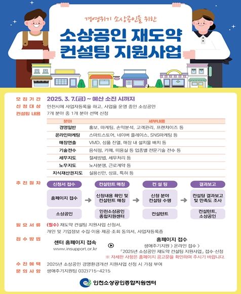 신청 접수는 3월 7일부터 시작되며, 자세한 사항은 인천소상공인종합지원센터 누리집에서 확인할 수 있다.