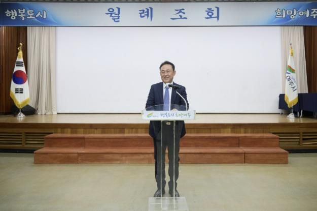 이날 월례조회는 ‘2025년 여주 남한강 정월대보름 달집태우기 축제’ 영상 시청, 모범시민 시장표창, 출렁다리이름 공모전 수상, 읍·면 세정평가 우수부서 수상, 성과관리부서평가 우수부서 수상 등 여주지역 발전에 헌신한 공무원과 시민분들께 시상을 했고, 이에 이충우 시장은 수상자들에게 축하 인사와 함께 성과를 창출한 공무원의 노력에 대해 감사 인사를 전했다.