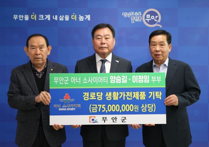 (아름다운교육신문) 전남 무안군은 7일 아너소사이어티 양승길·이정임 부부가 경로당 이용 어르신들의 편의 제공을 위해 7,500만원 상당의 생활가전제품을 기탁했다고 밝혔다.