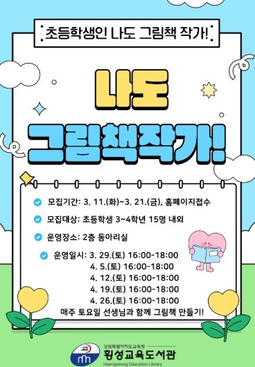 (아름다운교육신문) 횡성교육도서관은 3월 29일부터 4월 26일까지 매주 토요일 16시부터 18시까지 횡성교육도서관 2층 동아리실에서 이야기를 직접 구상하며 그려보는 ‘나도 그림책 작가! 강좌를 운영한다.
