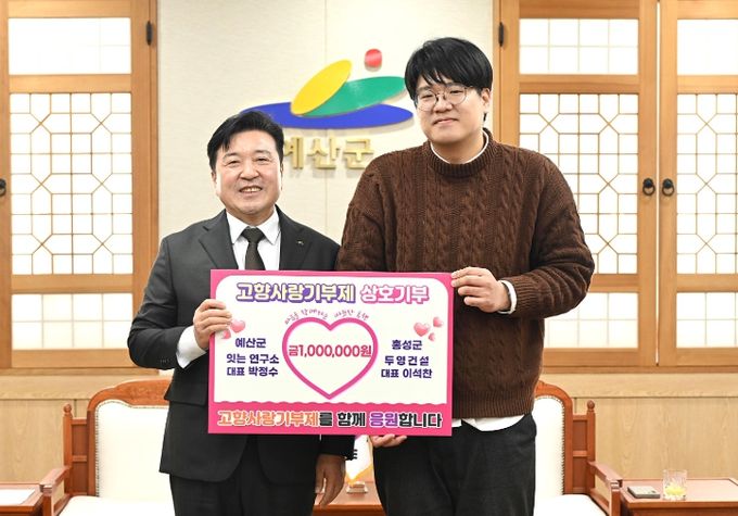 (아름다운교육신문) 예산군은 예산 소재 ‘잇는 연구소’와 홍성군 소재 ‘두영건설’ 대표가 상호 지자체를 응원하며 고향사랑기부금을 상호 기탁했다고 7일 밝혔다.