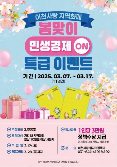 봄을 맞이하여 얼어붙은 민생경제에 활력을 불어넣기 위해 3월 7일부터 3월 17일까지 지역화폐를 합산 10만 원 이상 사용한 시민들에게 3월 24일 무작위로 2,000명을 추첨하여 정책 수당 3만 원을 이달 말까지 지급한다는 계획이다.
